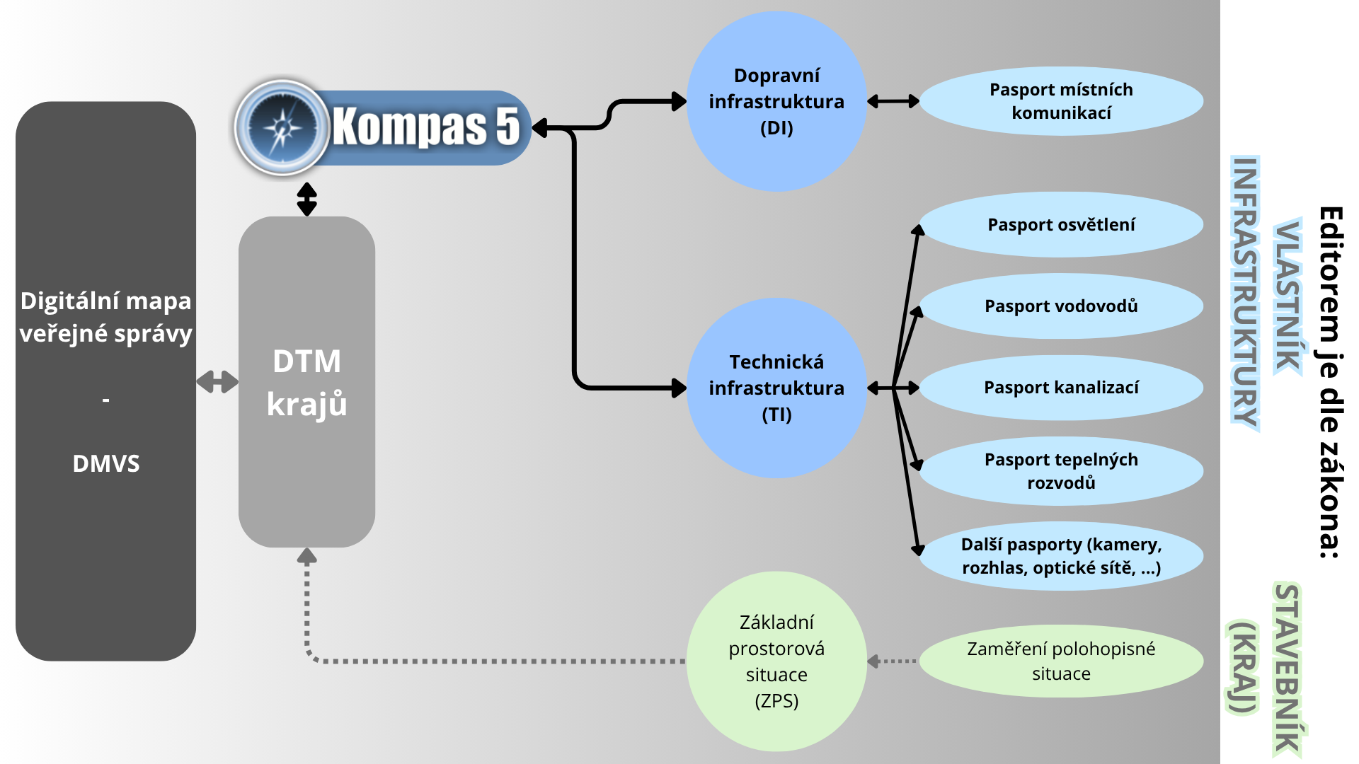 Zákonem č. 47/2020 Sb. byla krajům uložena povinnost vybudovat Digitální technickou mapu krajů (DTM), která pokrývá celé území příšlusného kraje. DTM se dělí na 2 dílčí části: evidenci dopravní a technické infrastruktury (DTI) včetně popisných údajů objektů a základní polohovou situaci (ZPS).